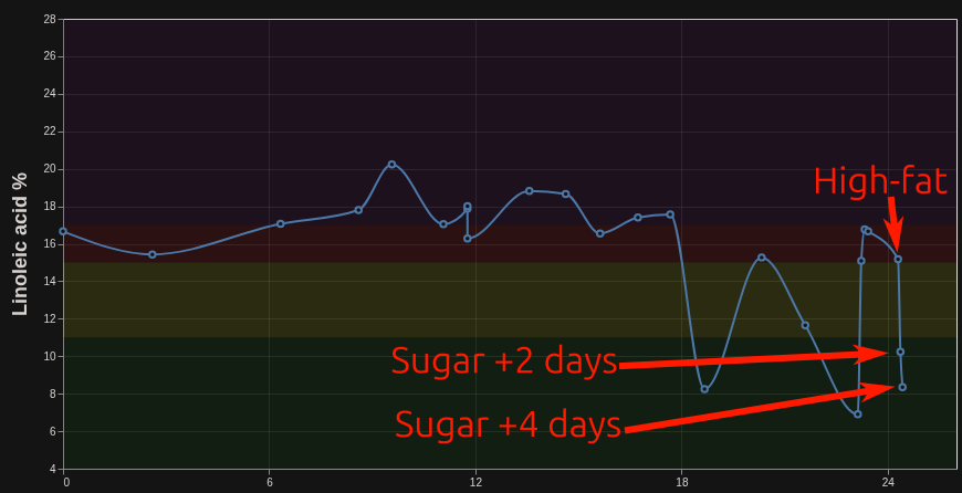 Here we can see that the drop in LA, caused by the upregulation of DNL, is just about as fast: going from 15.17% on the high-fat diet, my LA drops like a rock. Day 2 of the sugar diet it’s already down to 10.24%, and day 4 it is at 8.35%. Unfortunately I didn’t do a day 6 test, it might’ve gone a bit lower, like the 6.9% I’ve tested previously.