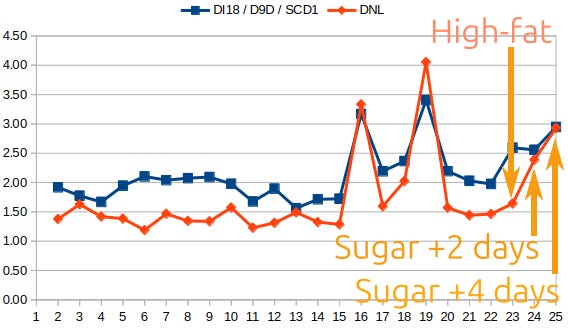Here’s 2 ratios from my fatty acids that make it more visible, including the actual DNL (defined as palmitic acid over linoleic acid). Note that in this graph, the X axis isn’t temporal, it’s just evenly spaced out data points - even if the last 4 data points happened in rapid succession every 3 days.