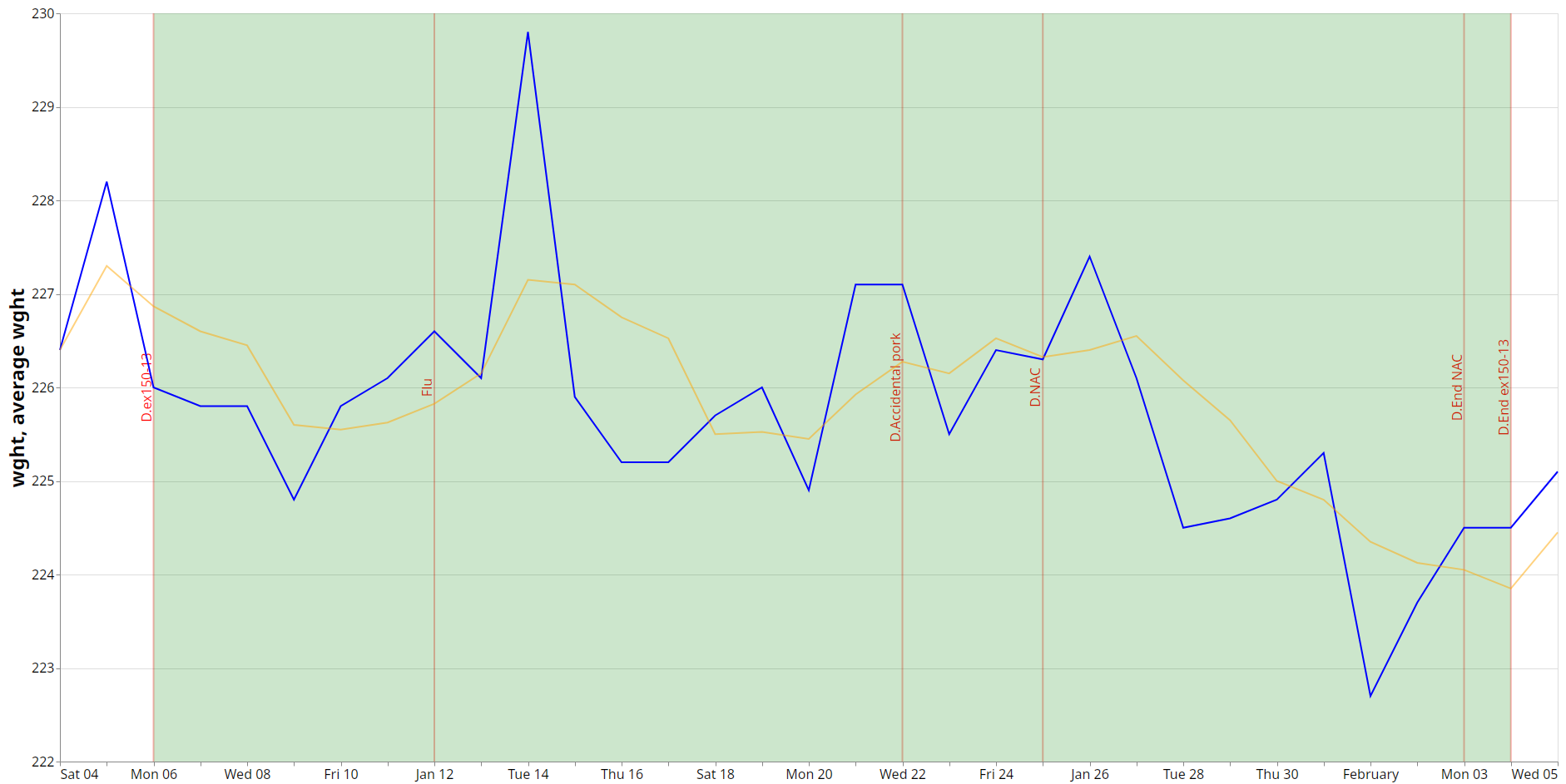 I had the flu about a week in, which I think caused the 1 day of very high weight spike to nearly 230lbs. Maybe fever/inflammation.