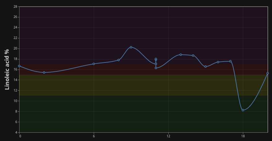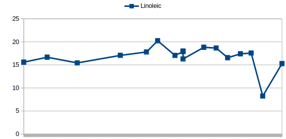 My linoleic acid was 15.27%. That is the lowest I have ever measured except during the rice diet (8%).