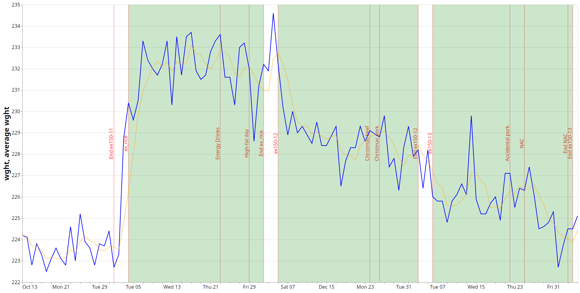Here’s my weight during that time. I started off above 226lbs and ended up averaging around 224-225lbs, even dropping into the 222.x range briefly.