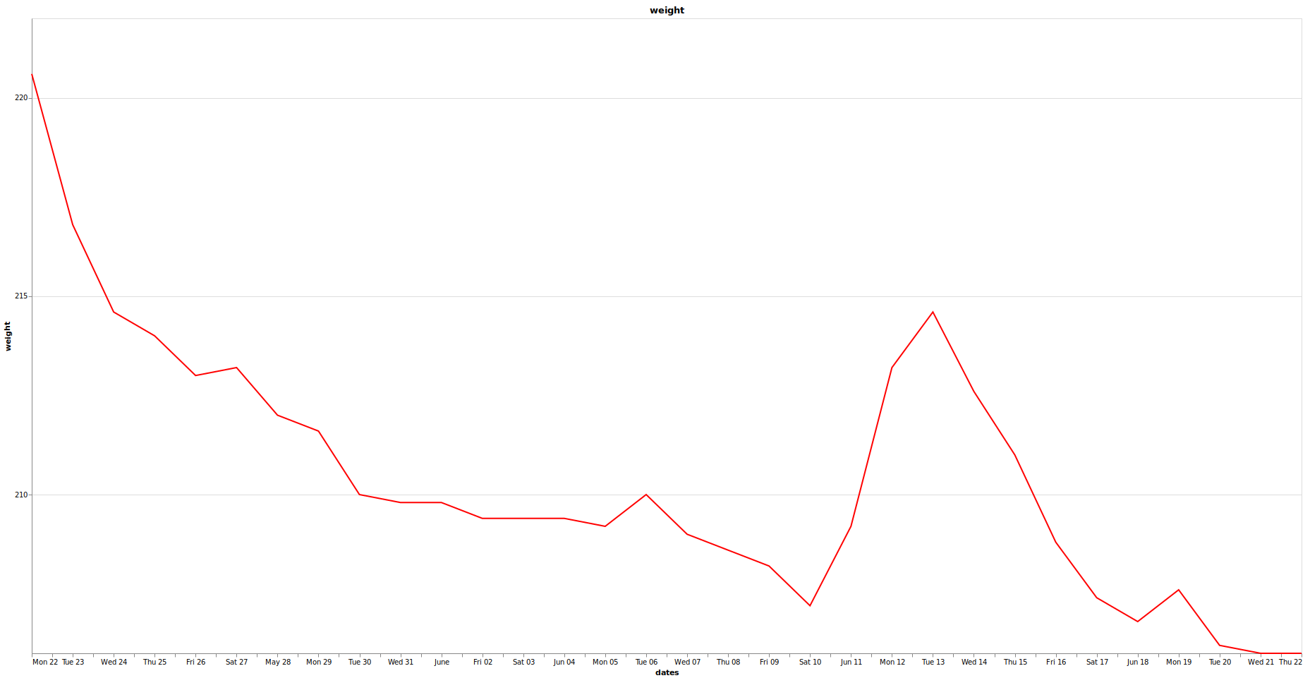 Near the end she went off the diet for 3 days in a row, and she quickly gained a bit of water weight. Luckily, it came down just as fast, and she was back near her old weight within 4 days. It’s encouraging to see that one can go off the diet for a little bit, and the damage won’t necessarily be that bad.