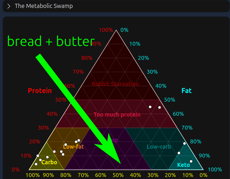 Yet I hadn’t seen anyone try a really low-protein diet that was swampy. It should actually be easier than low-protein high-starch, because you can dilute the high protein content of starch (typically ~10%) by adding the fat.
