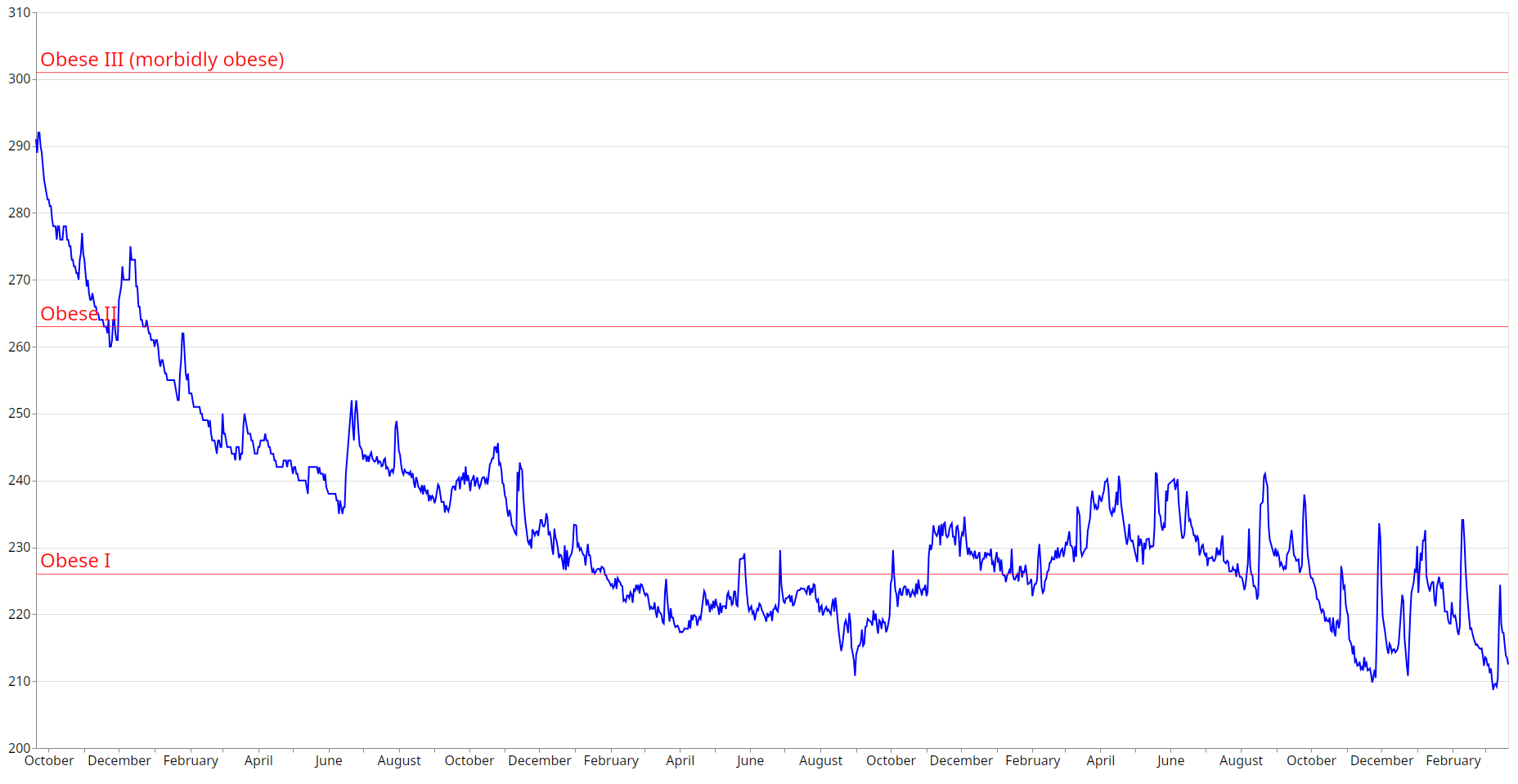 In this graph, the red “Obese I” line represents the border between “overweight” and “obesity” as measured by BMI. It’s at about 227lbs for me. You can see that I broke through it in January of 2024, about a year and 2 months after I started ex150. And I tend to stay below that line unless I experiment with other diets.