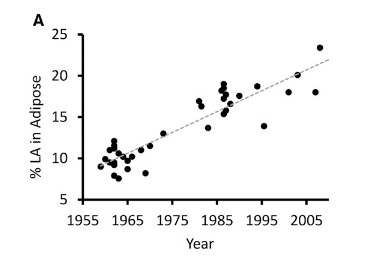 And yes, our modern starting point is likely as high as the seed oil-group was in the L.A. veterans study: one analysis from 2015 indicates that people’s average linoleic acid as percentage of body fat rose steadily: