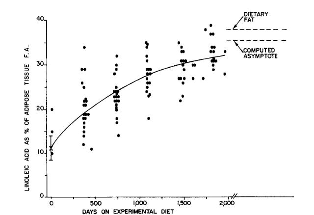 Your body constantly releases some of your body fat via lipolysis and it enters circulation, same as if you’d eaten fat that day. What that means is that even if you stop eating any seed oils or other foods with linoleic acid, you’re still getting a constant drip of it - from your own body fat!