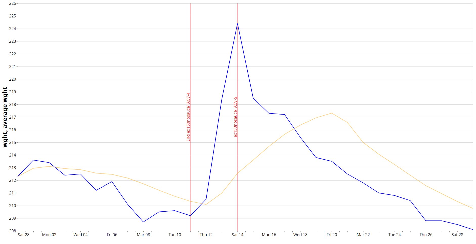Look at this graph of my weight over the last 30 days. There’s an insane peak of going from 209lbs to 224lbs in just 2.5 days of refeed, but the average (yellow line) only ever, slowly, reaches 217lbs.