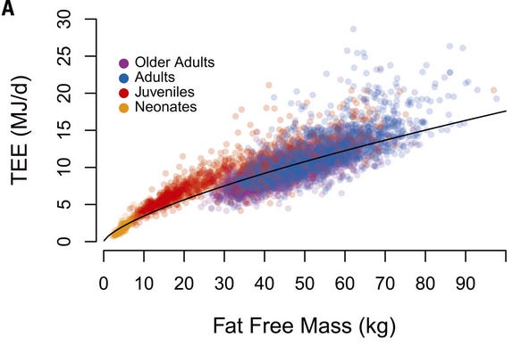 Luckily, Pontzer’s paper explains the formula they arrived at, describing the average TEE (in megajoule) for any given Fat Free Mass (FFM, in kg):