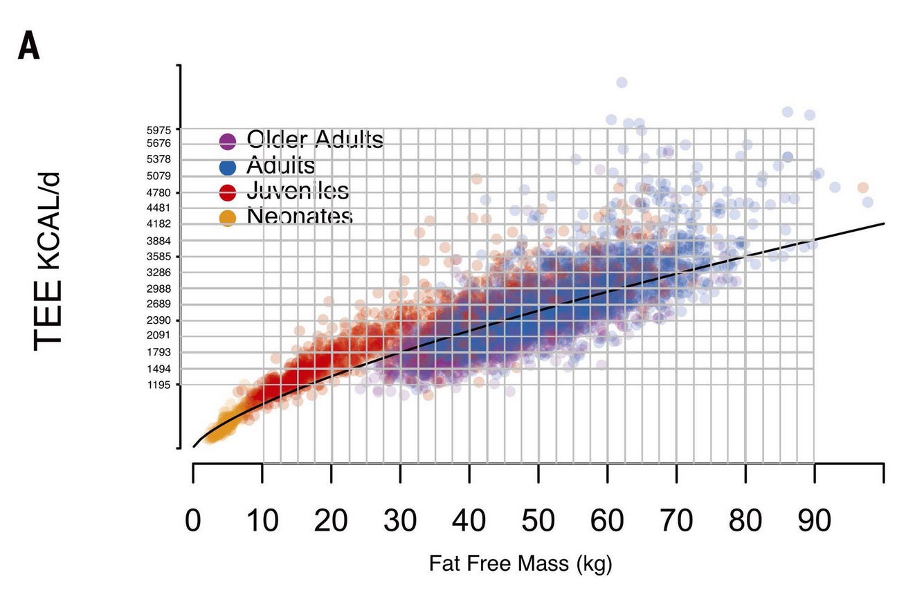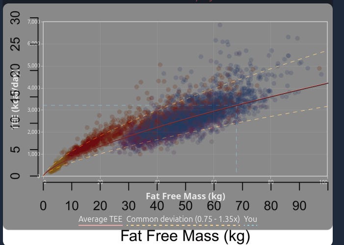 The red line is the exact same curve as in Pontzer’s study, and the blue dashed lines show where you are on it: connecting from your FFM on the X-axis to the expected TEE on the Y-axis.