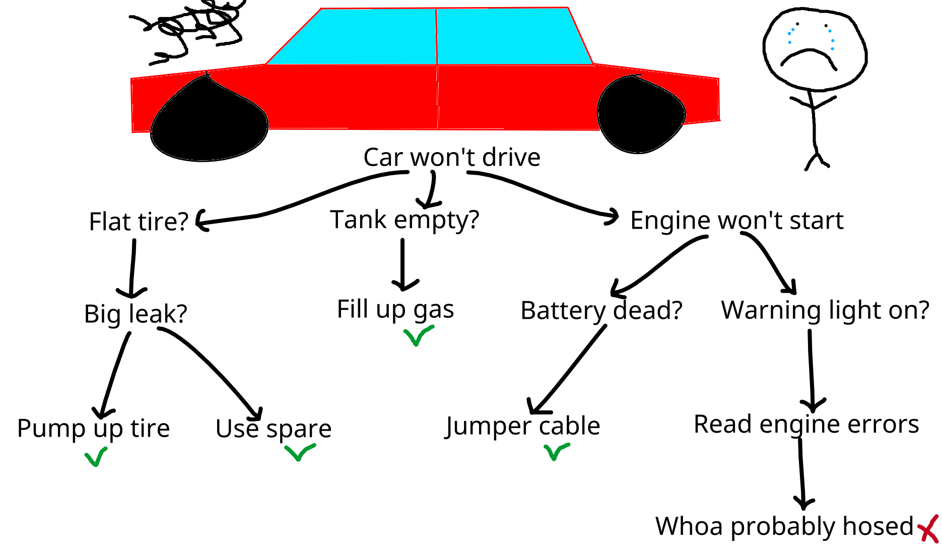 Although the tree has a lot of possible problems and solutions, it only takes a few steps to walk from the root (“Car won’t drive”) to any given solution.