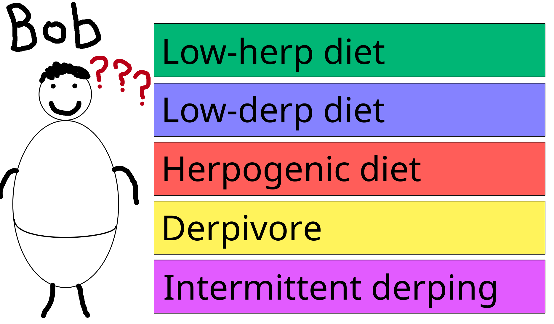 Bob decides to try the Low-derp diet. He buys a Low-derp cookbook, throws out all the derpy foods in his pantry, and buys a lot of foods containing herp instead.